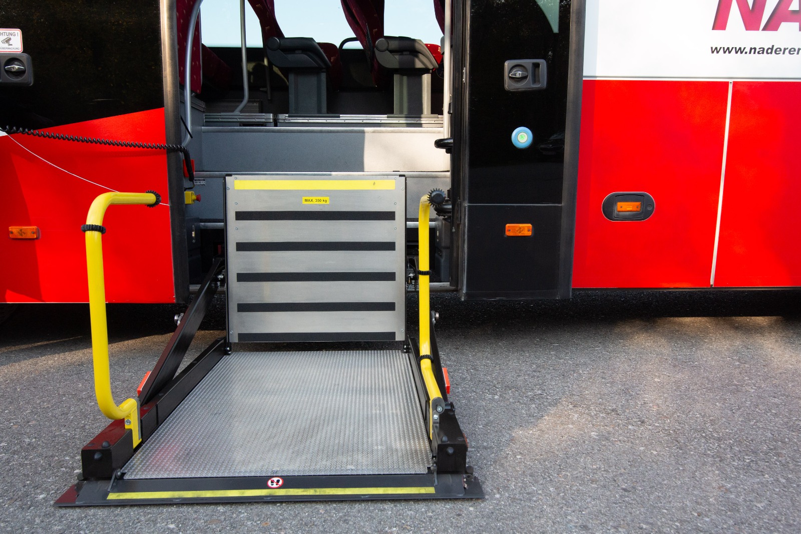 Some of our buses are equipped with a modern hydraulic lift, which makes it possible to comfortably transport people in wheelchairs onto the bus. Thanks to this practical device, access for passengers with reduced mobility is made much easier. Once on the bus, the wheelchair is securely fastened or alternatively stored in the spacious trunk, depending on the individual needs of the passengers. Our bus drivers are of course happy to help you get on and off the bus to ensure a pleasant and smooth journey.